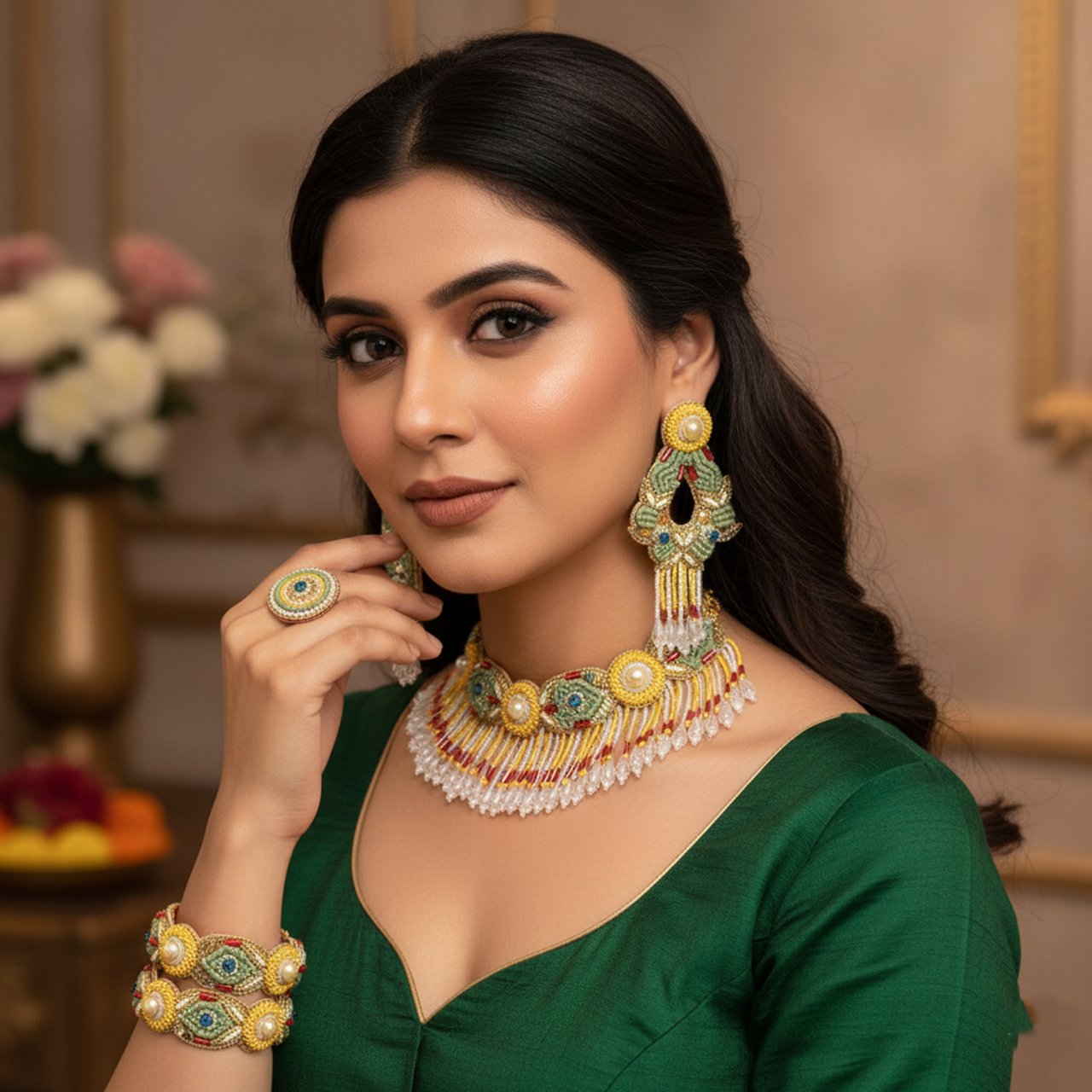 Occasion: Vibrant and colourful handmade beaded , sequins ,crystals necklaces, earrings and ring that add a pop of colour to any traditional and contemporary wedding outfits