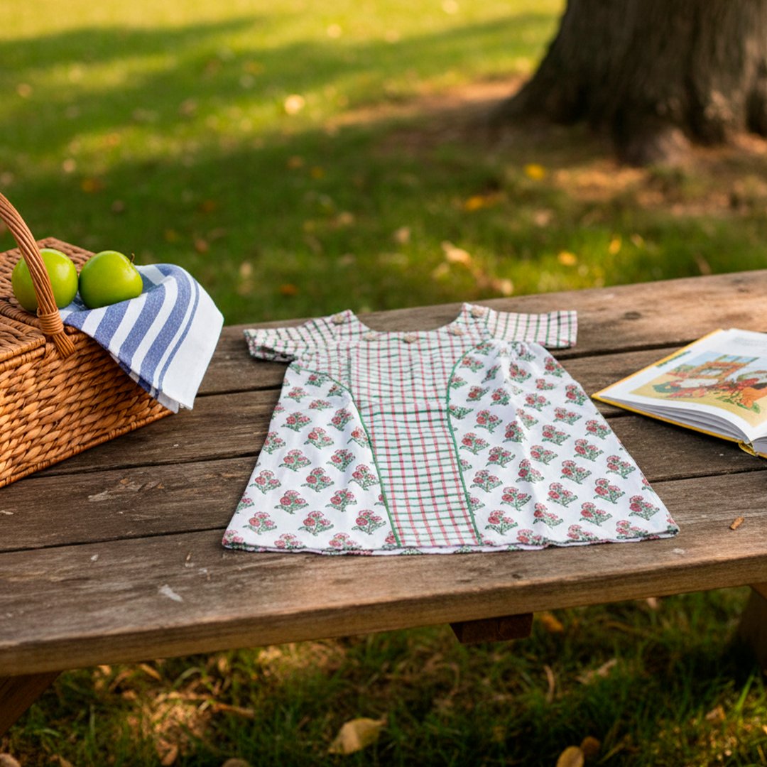 This charming hand-block printed frock for baby girls blends playful patterns with artisanal craftsmanship. Made from soft, breathable cotton, it features a unique dual-print design that is perfect for bright, sunny days.