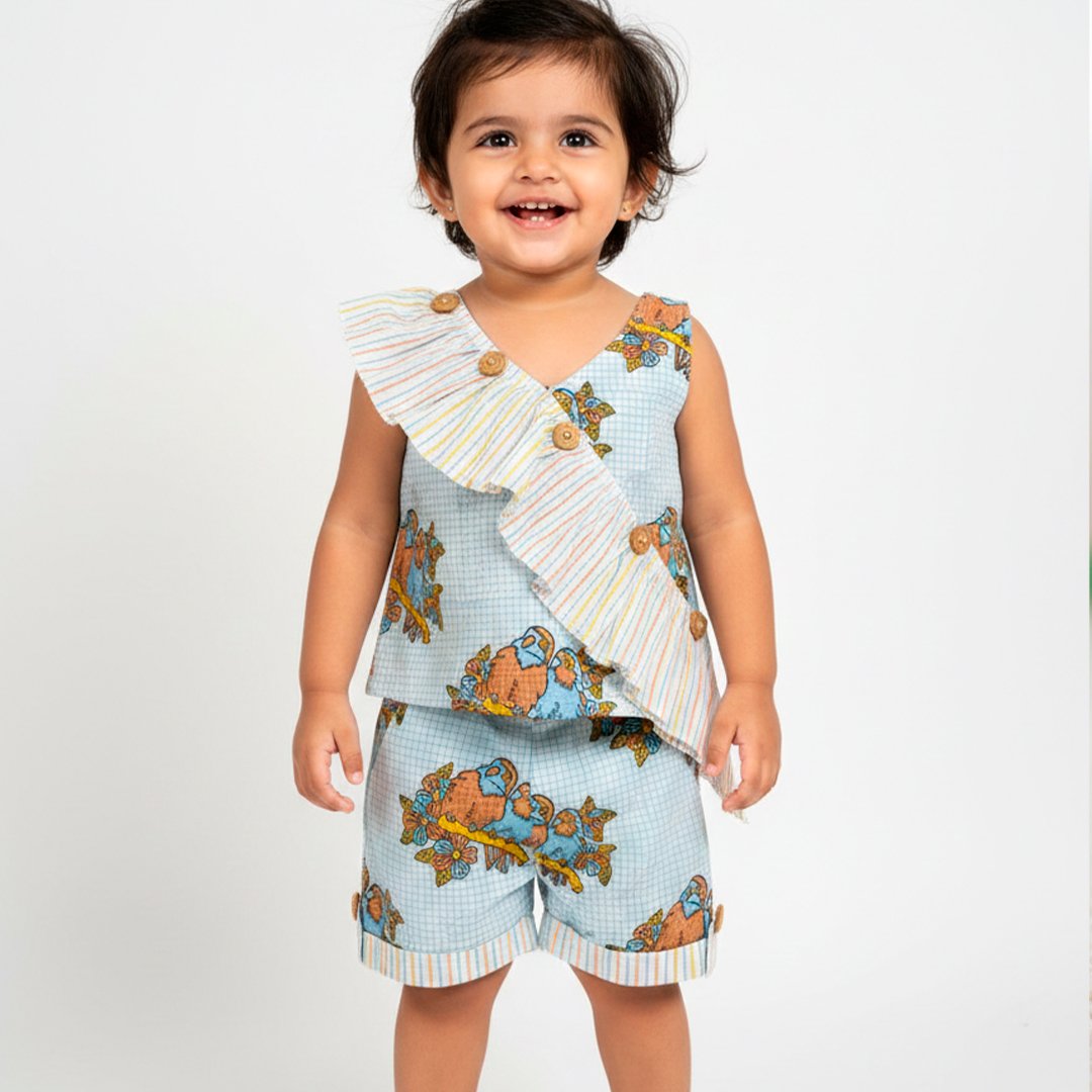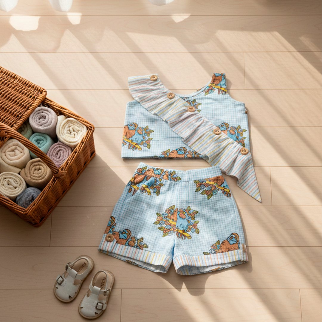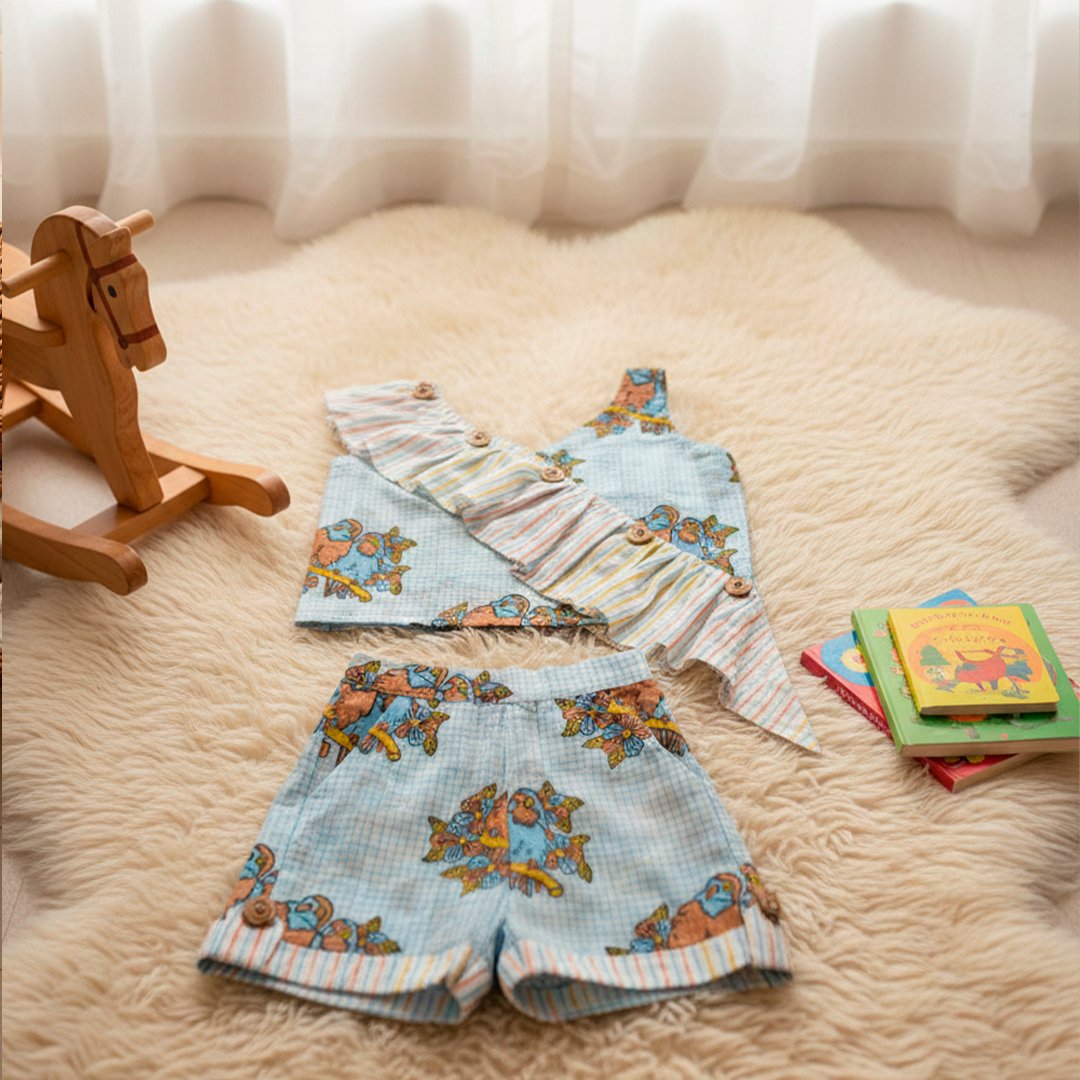 This charming hand-block printed co-ord set is a perfect blend of whimsical design and breathable comfort, making it an ideal choice for a young girl’s summer wardrobe.