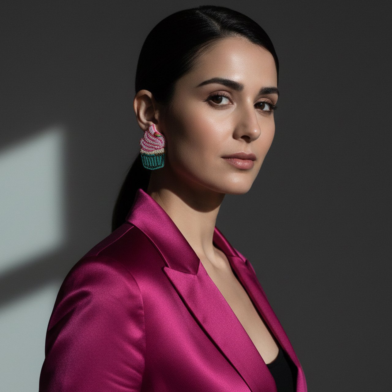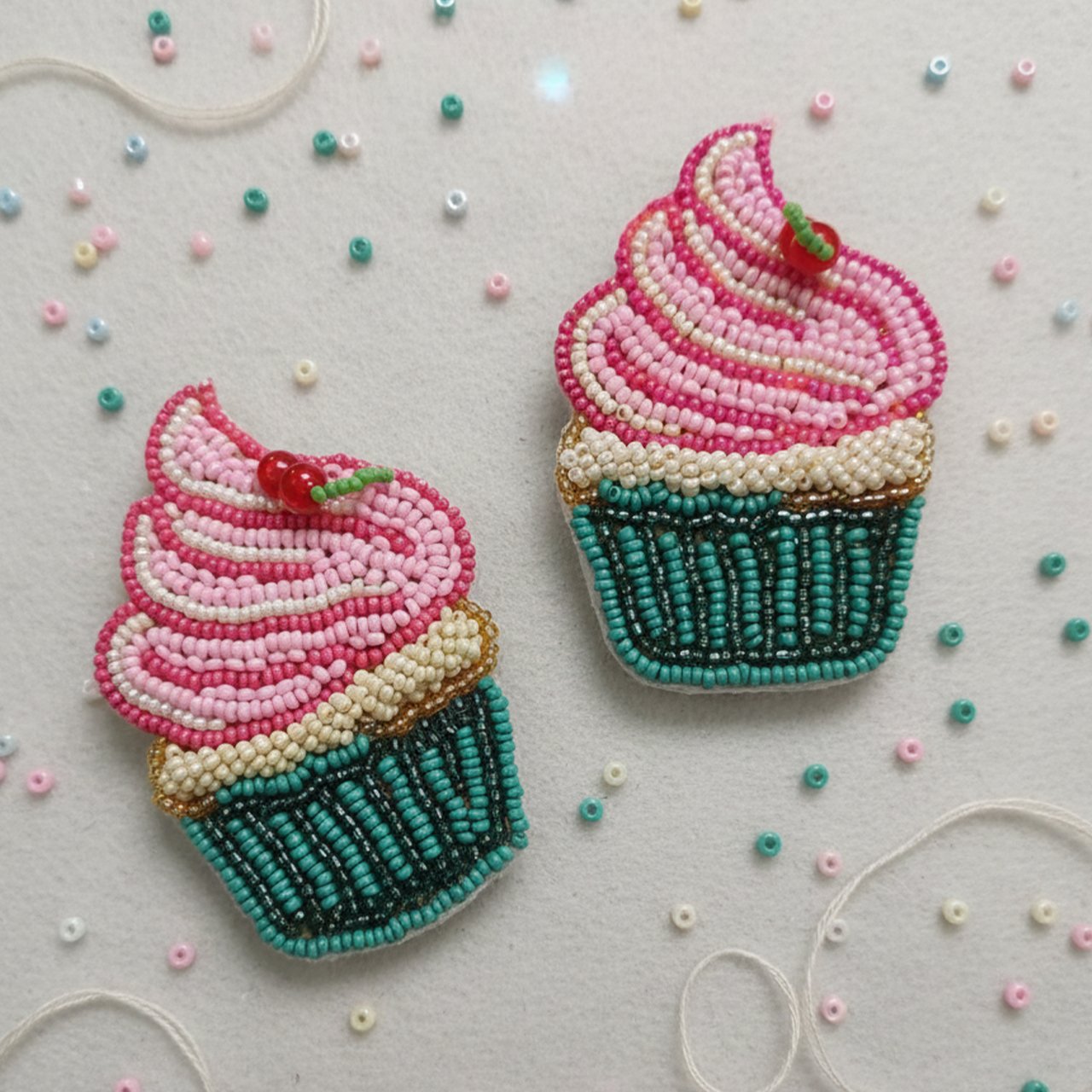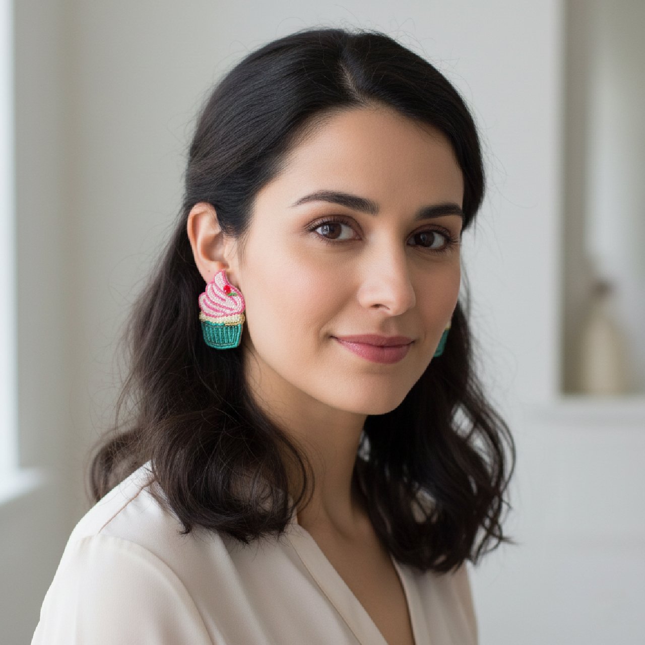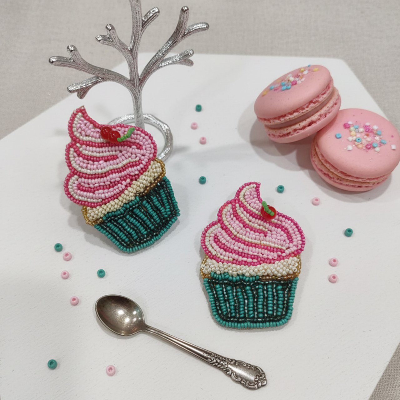 These adorable earrings are intricately hand-beaded to resemble miniature cupcakes. They feature a vibrant pink and white swirled “frosting” accented with a tiny red cherry on top, sitting in a contrasting teal/turquoise cupcake liner. Perfect for adding a fun, sweet, and unique touch to any outfit.