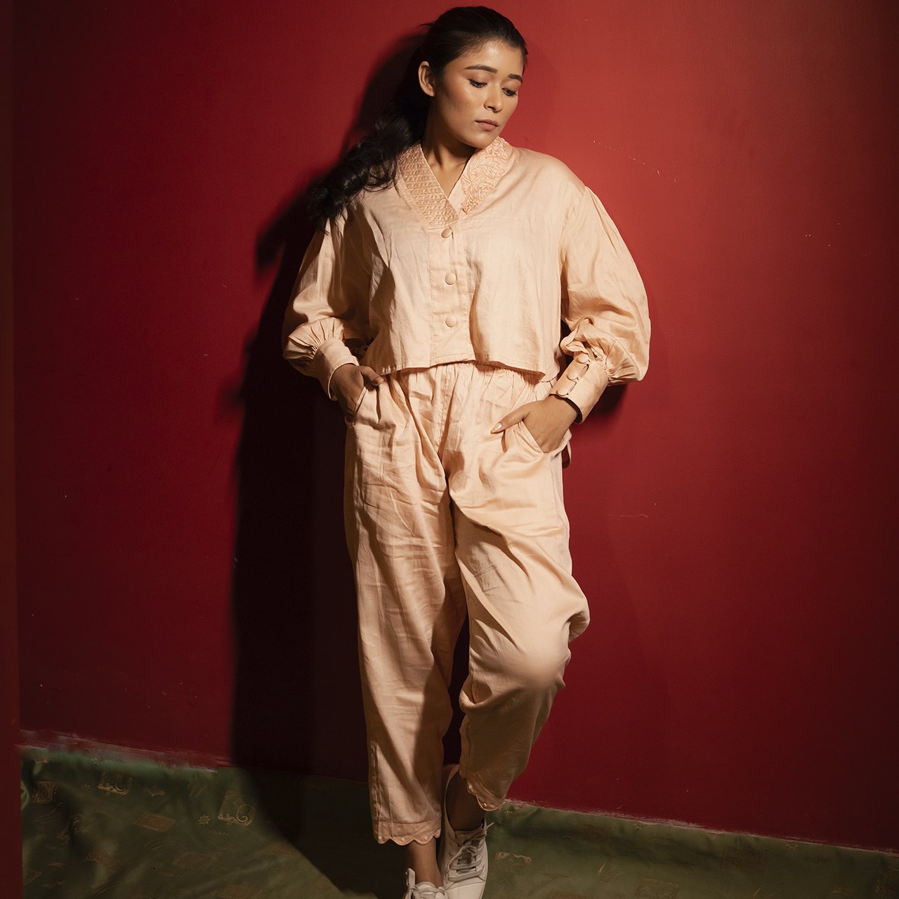 Designer Peach Flower Hand Embroidered Cotton Co-ords Set in Tonal For Women