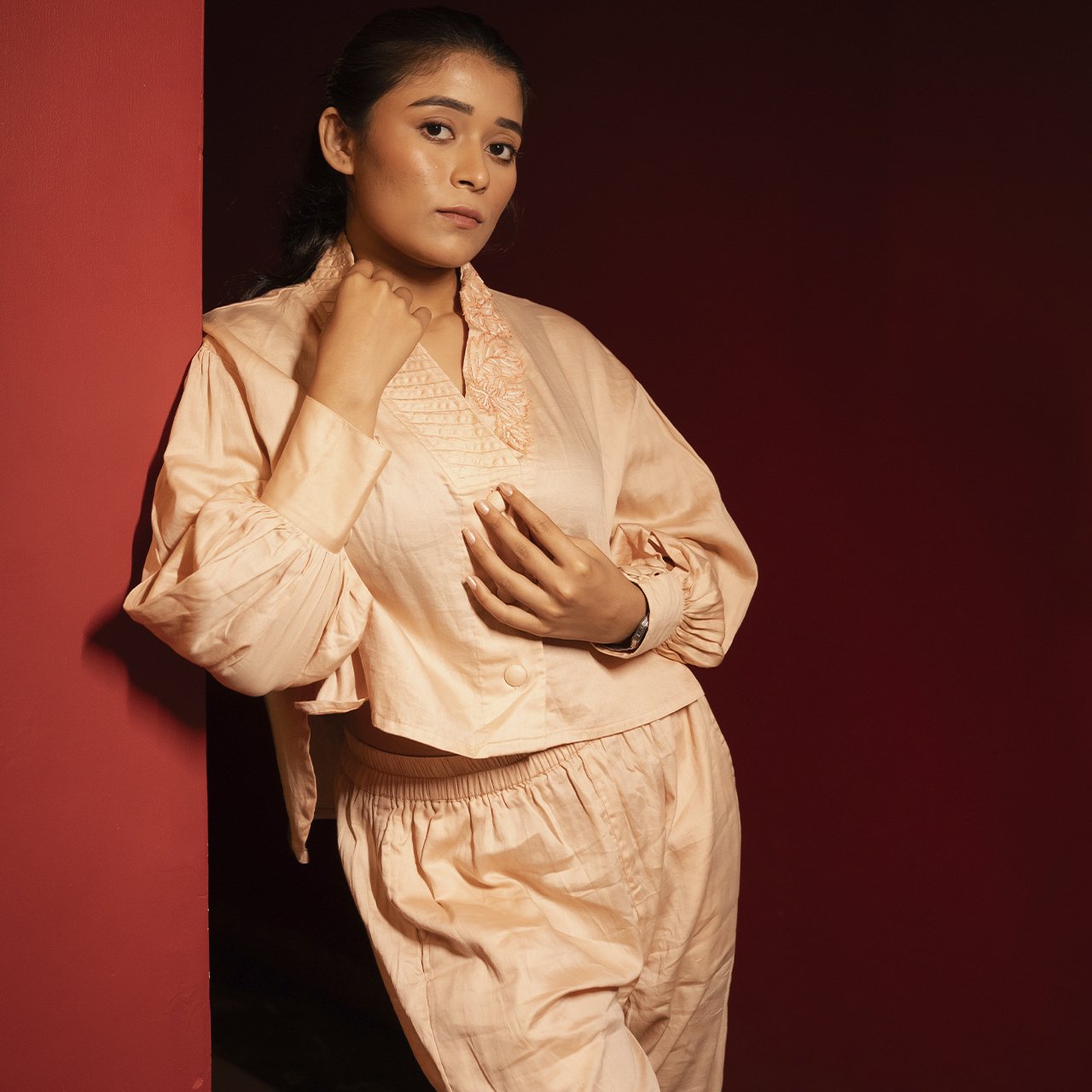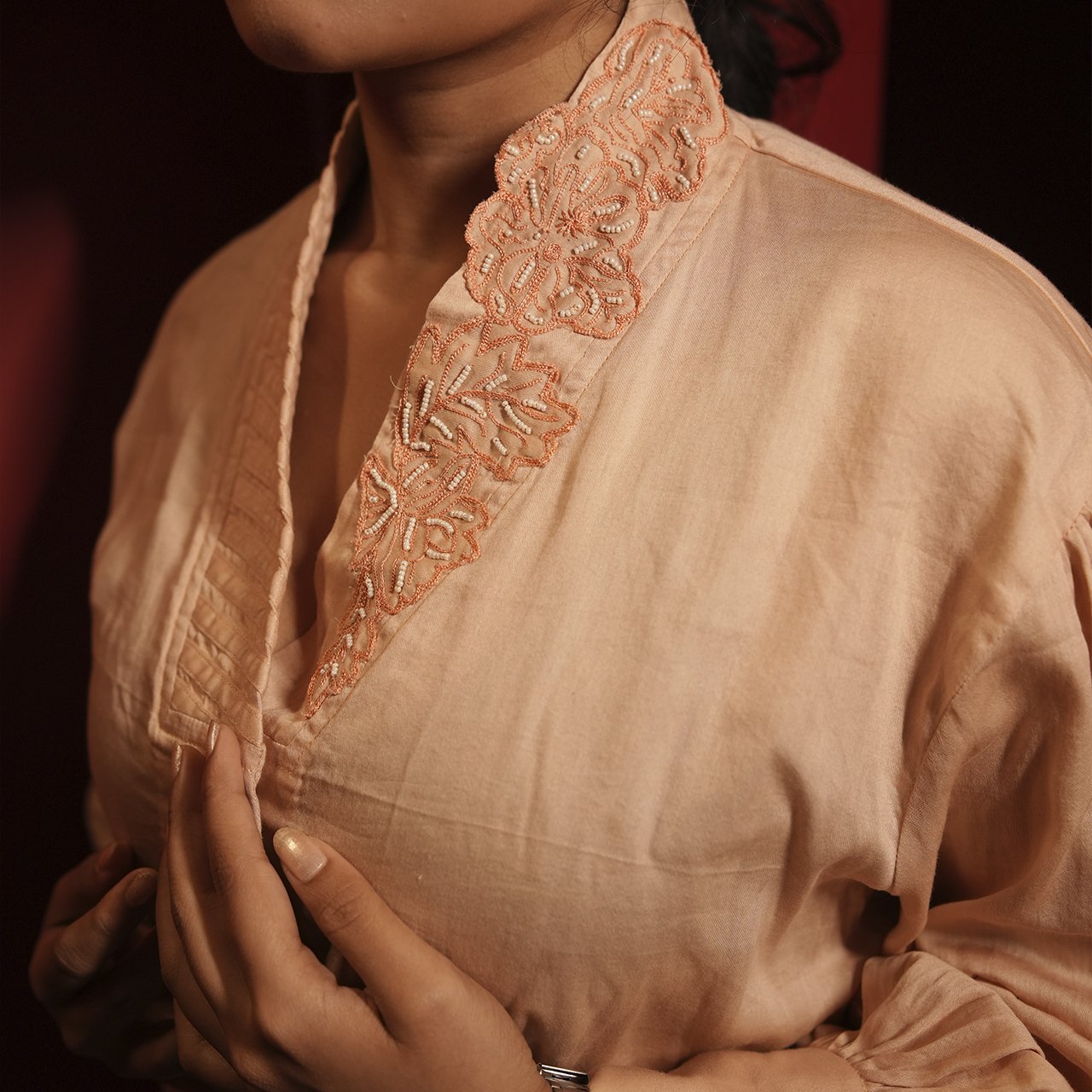 Women Peach Tonal Hand Embroidered Co-ordinated Set Of Shirt And Straight Pant.