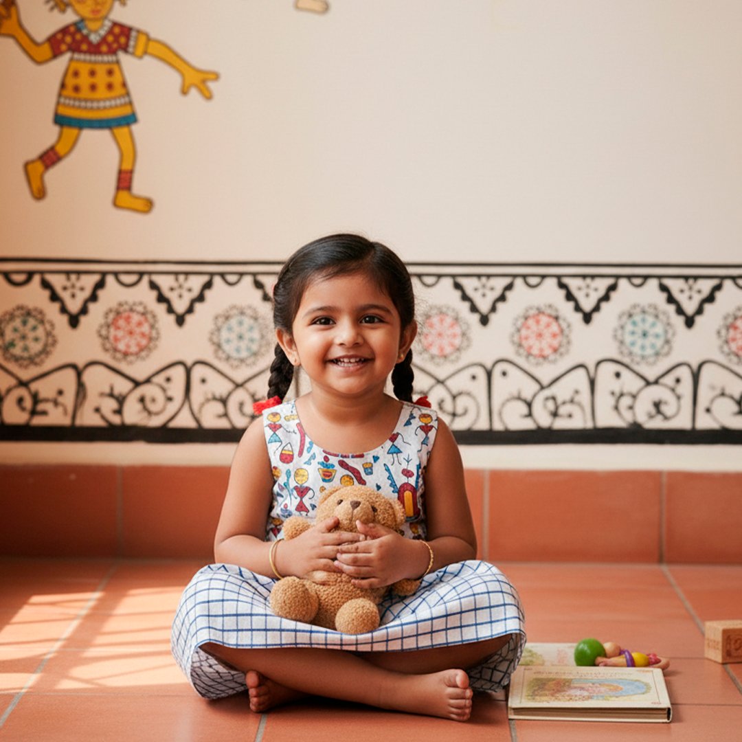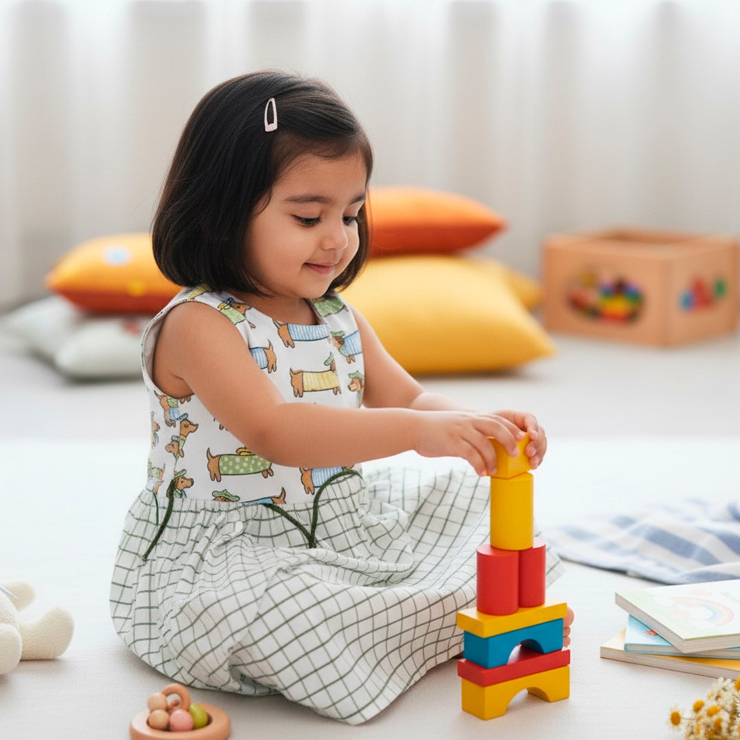 This delightful sleeveless hand block printed cotton frock is perfect for a little one.