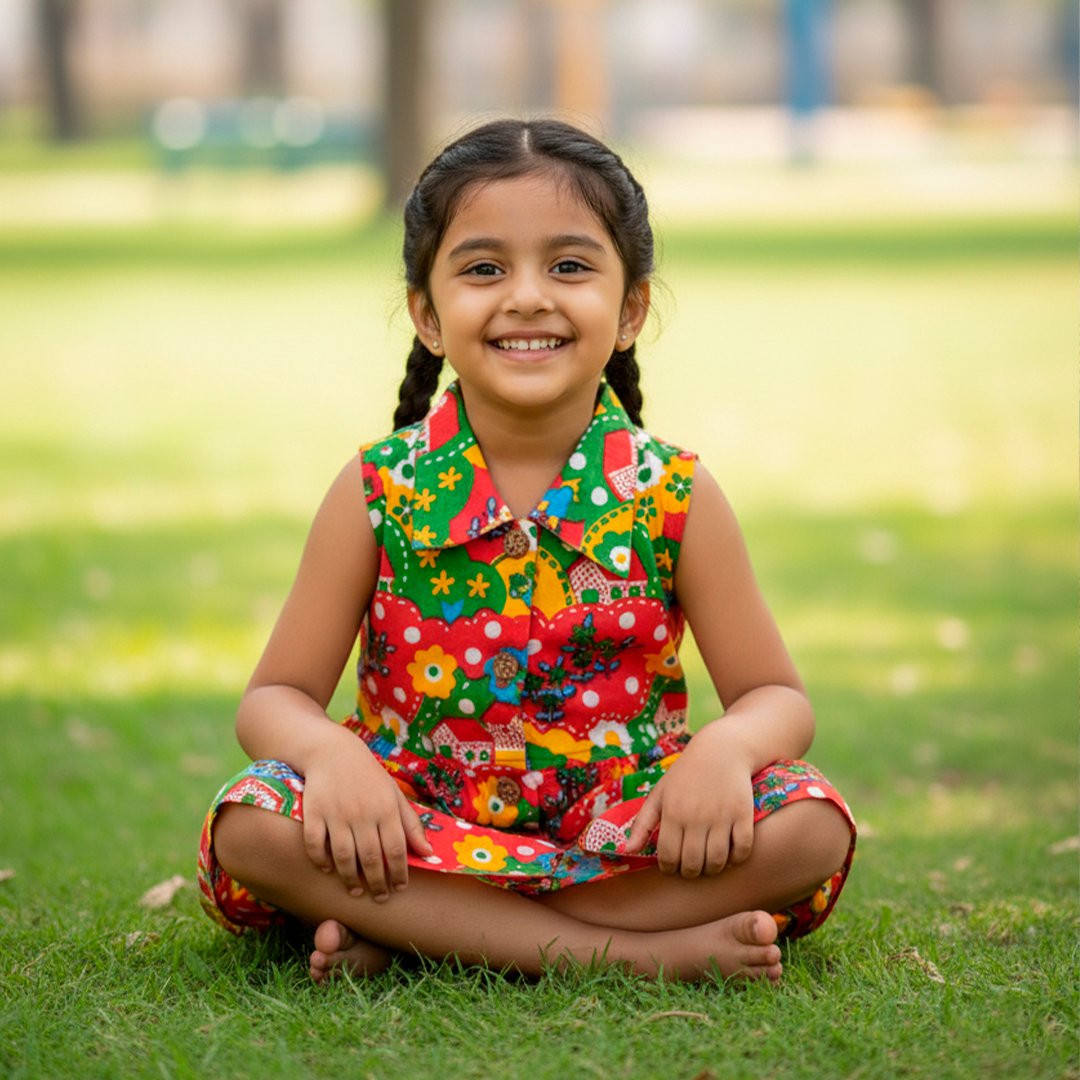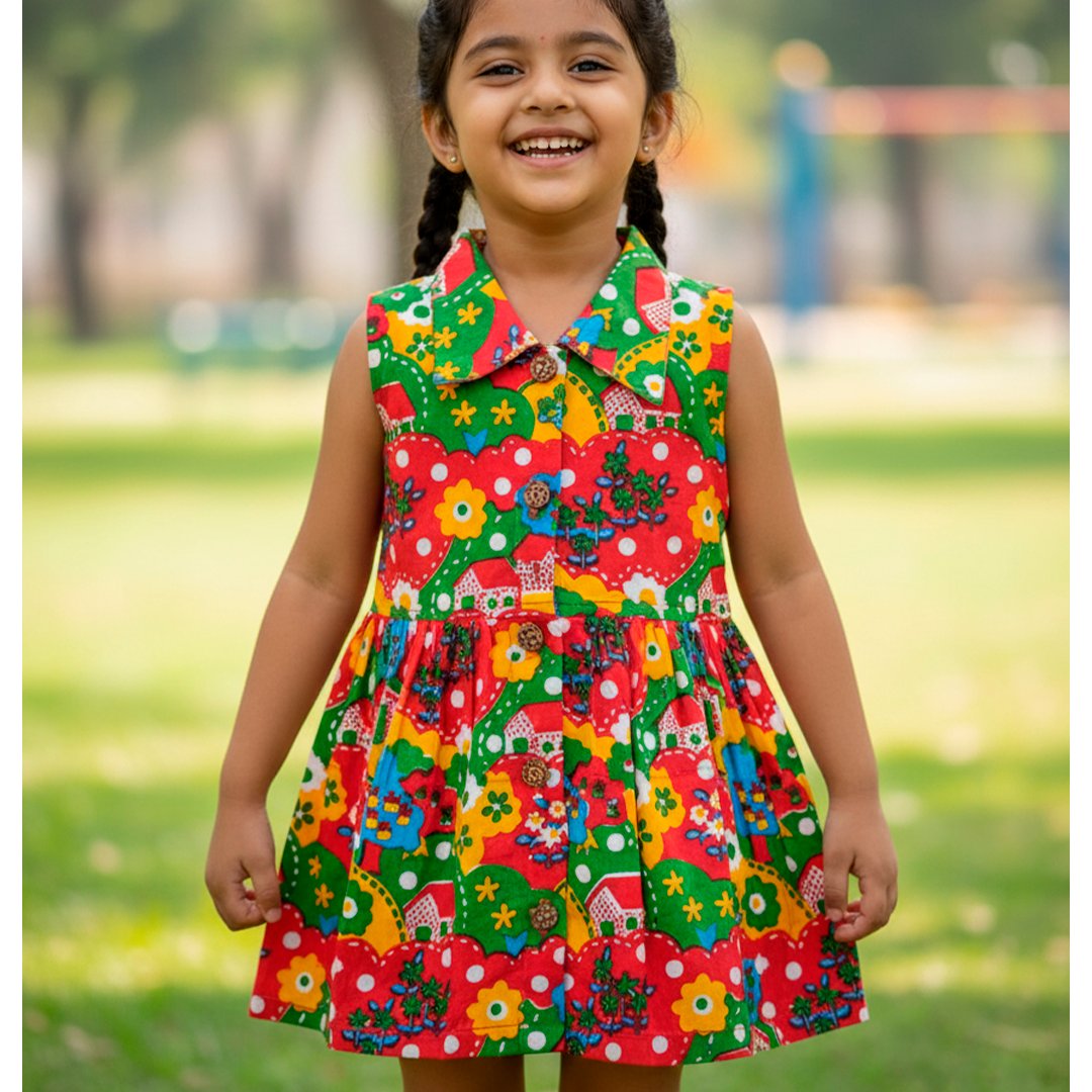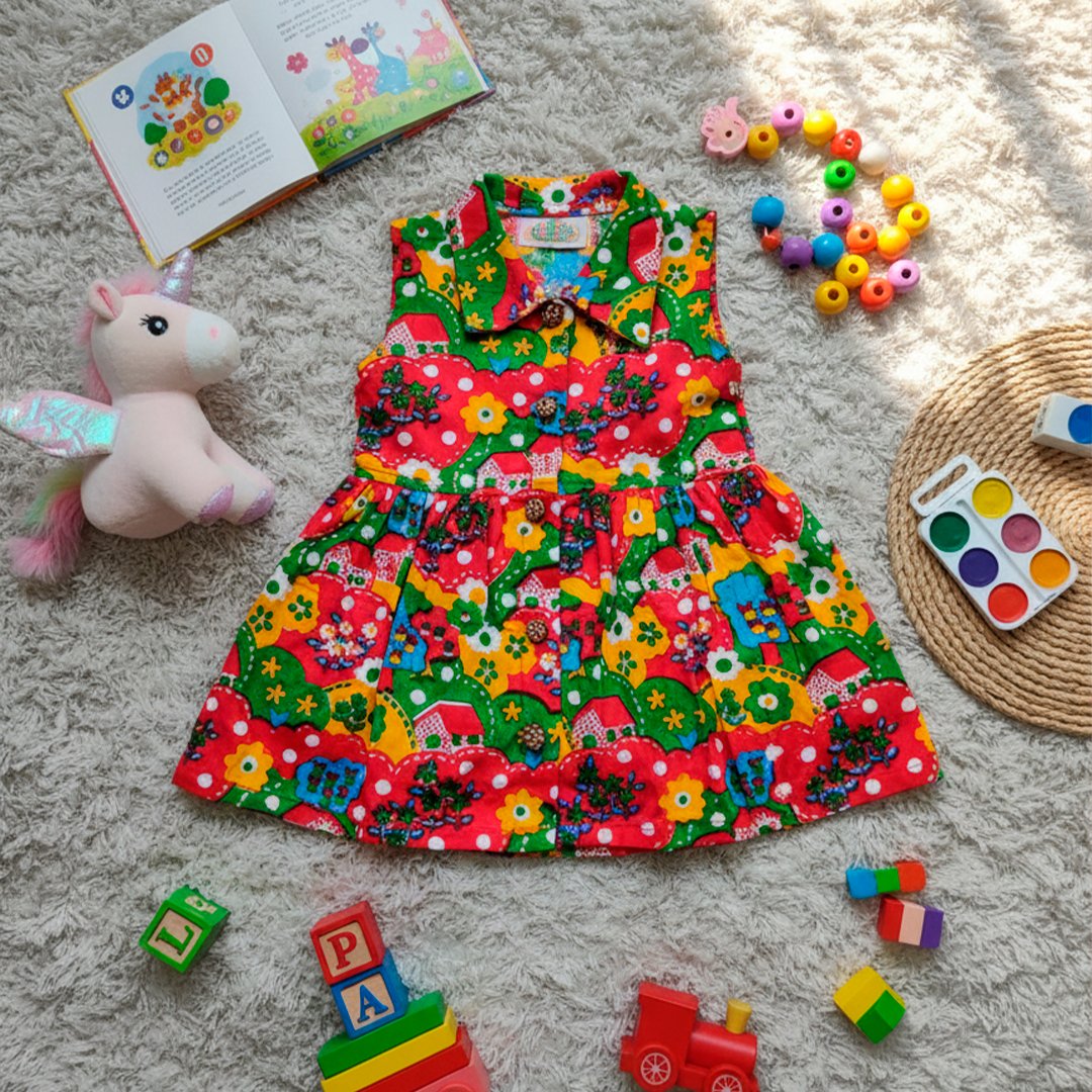 This is a cheerful and colorful sleeveless frock made from breathable cotton fabric. It features an attractive all-over hand block printed design, showcasing a playful pattern of floral and village motifs (like houses and trees).