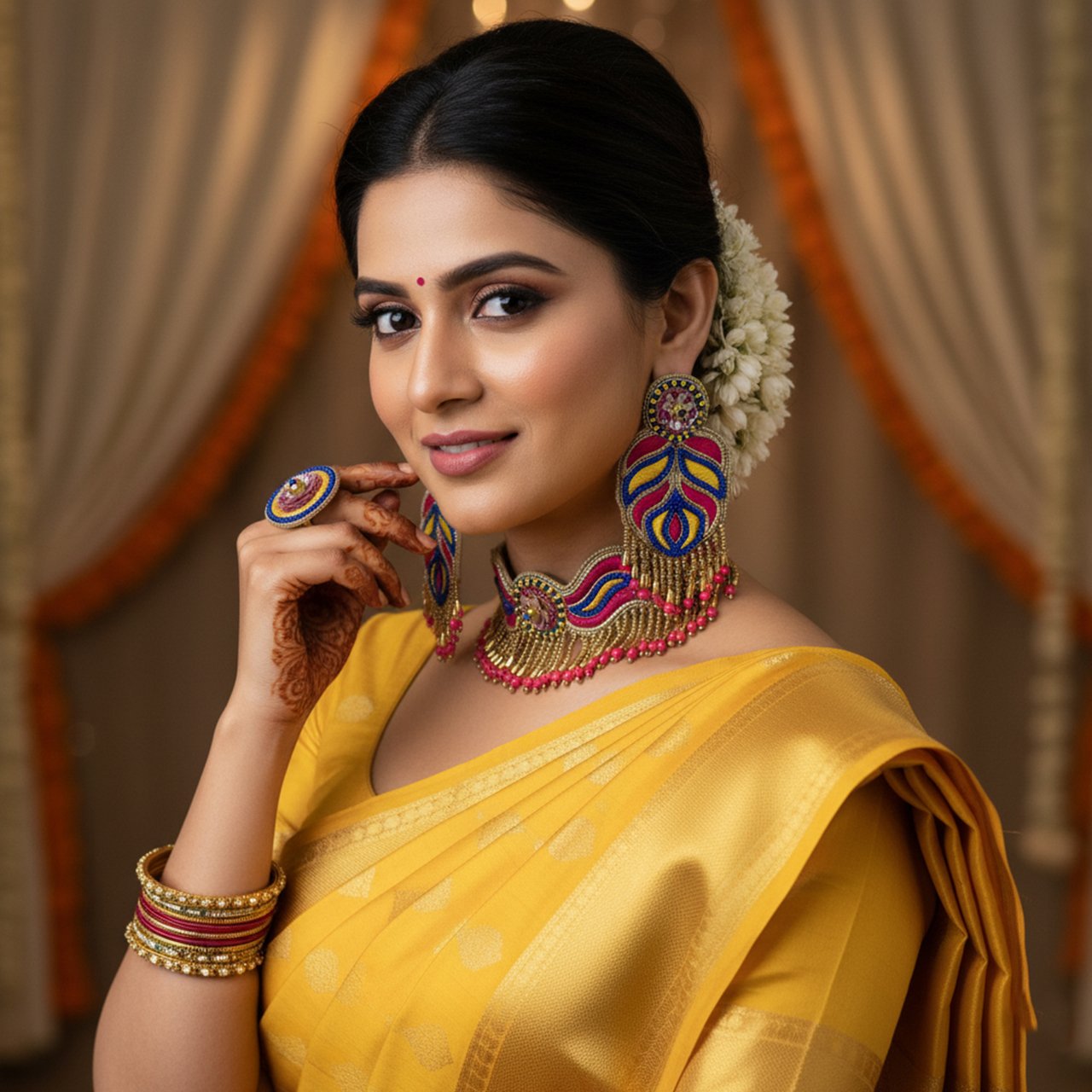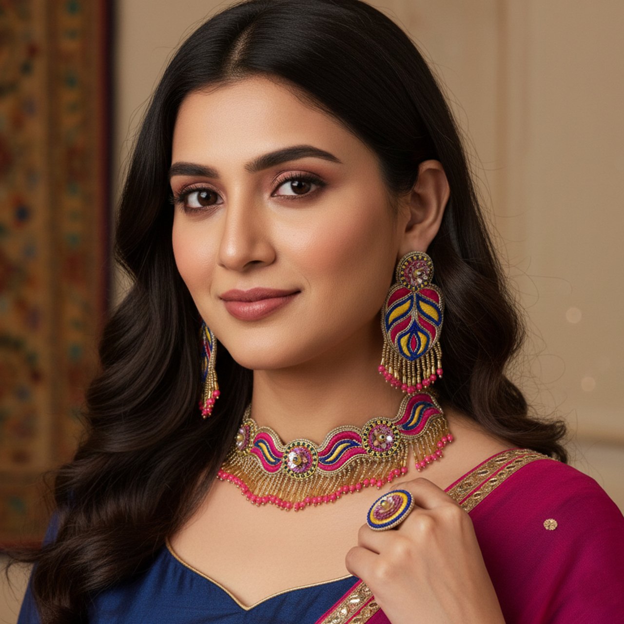 Occasion: Vibrant and colourful handmade beaded , sequins ,crystals necklaces, earrings and ring that add a pop of colour to any traditional and contemporary wedding outfits