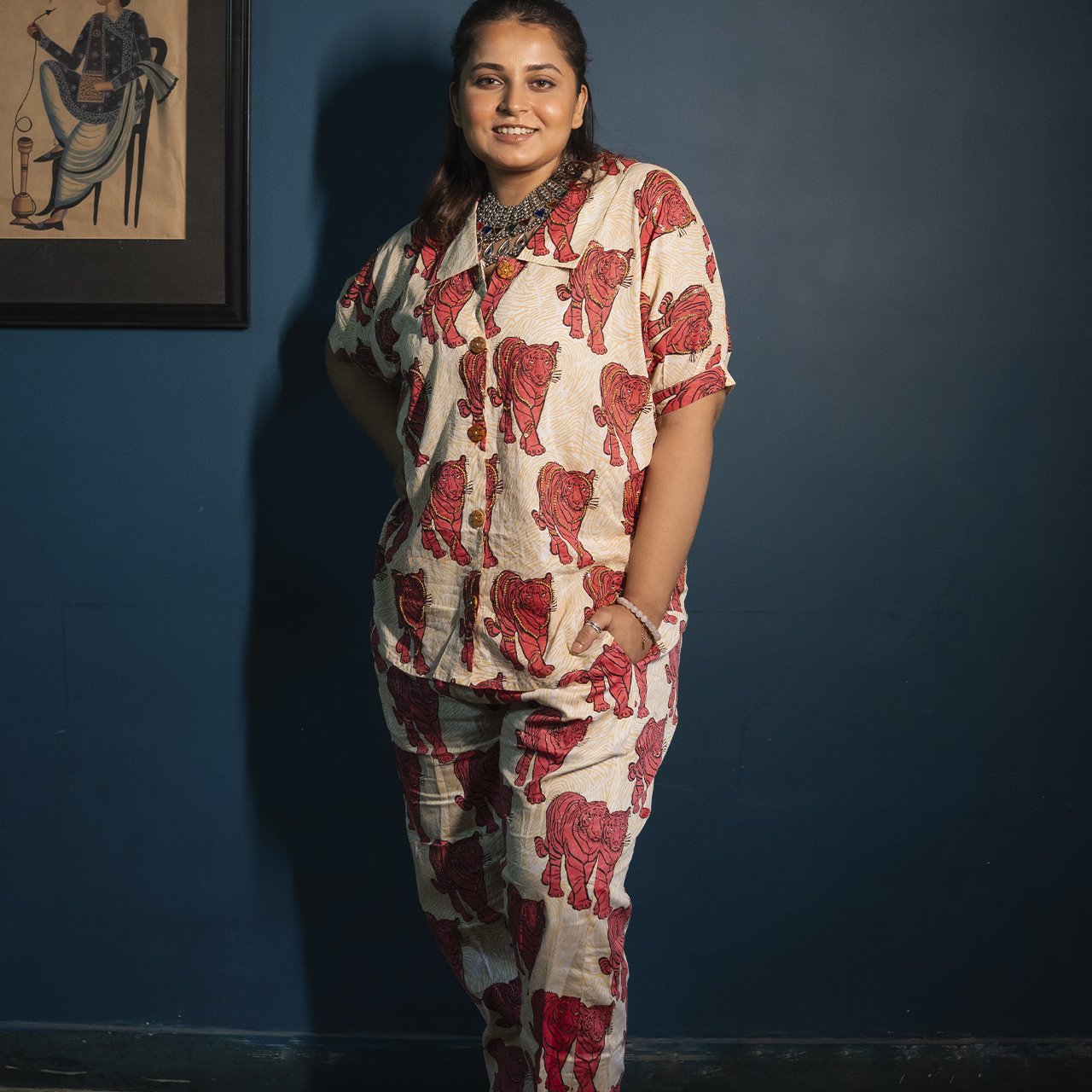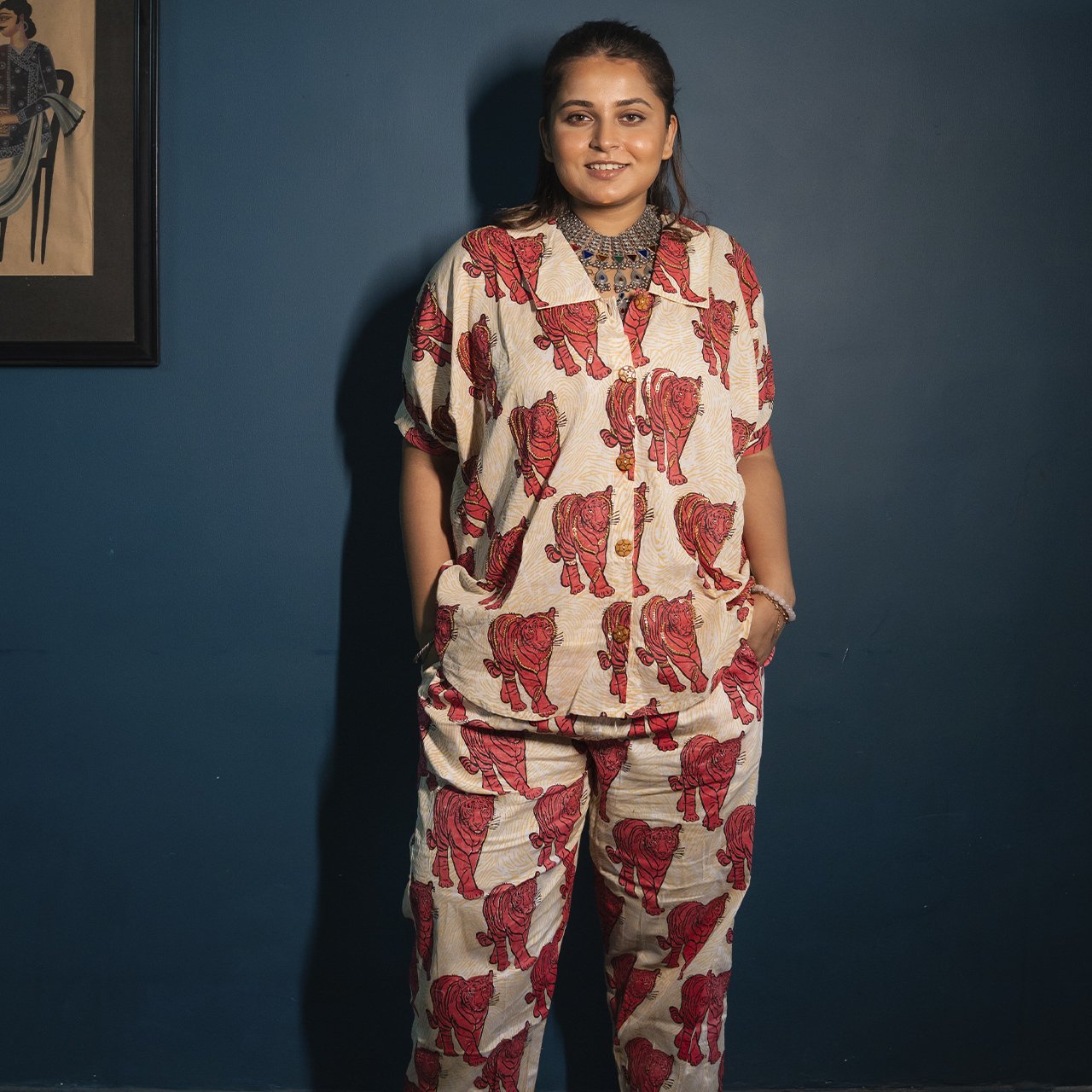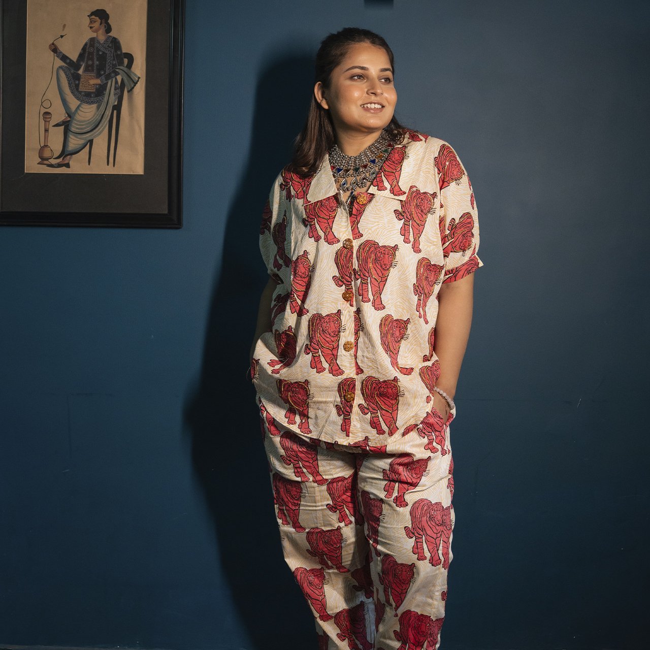 Women Pink Tiger Printed Co-ordinated Set Of Shirt And Straight Pant.