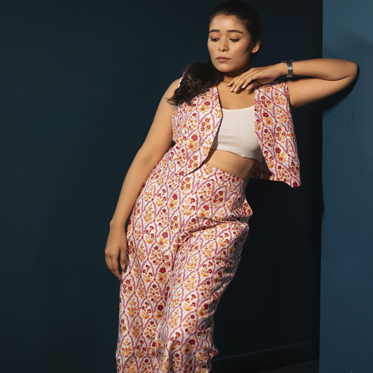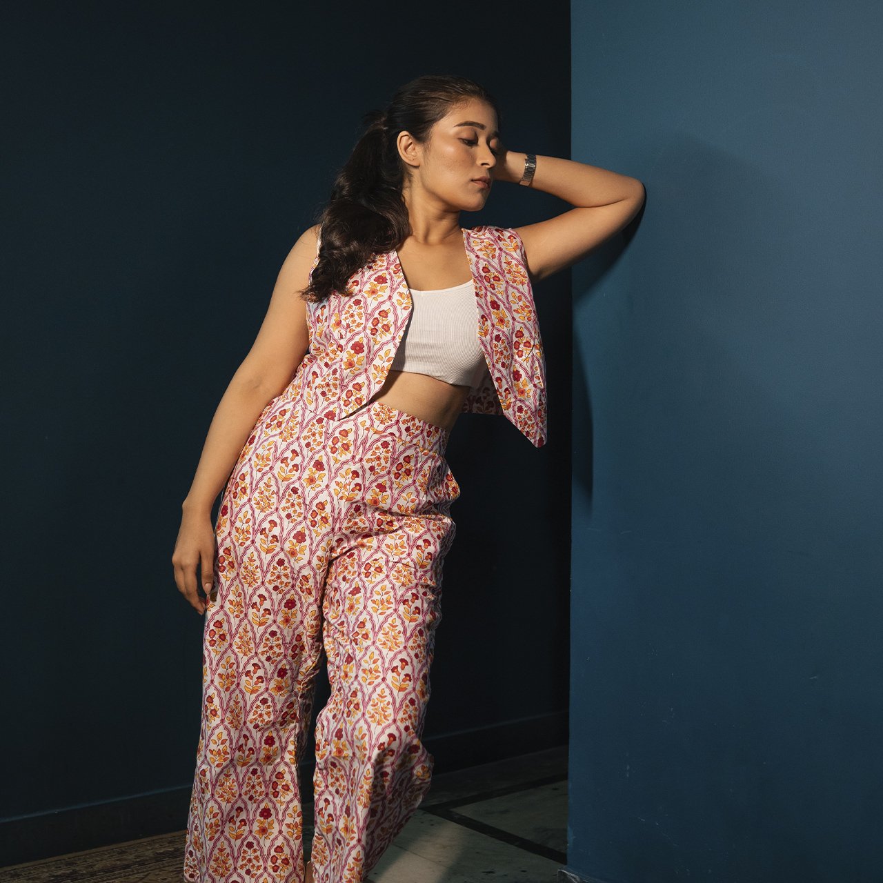 Women Pink Yellow Flower Buta Block Printed Co-ordinated Set Of Jacket And Straight Pant.