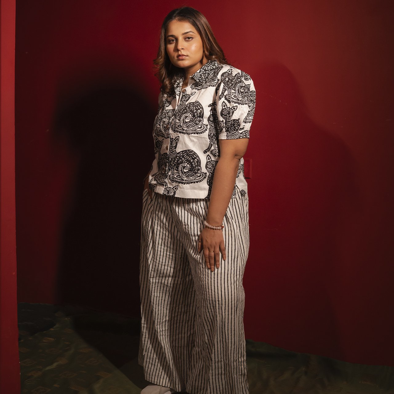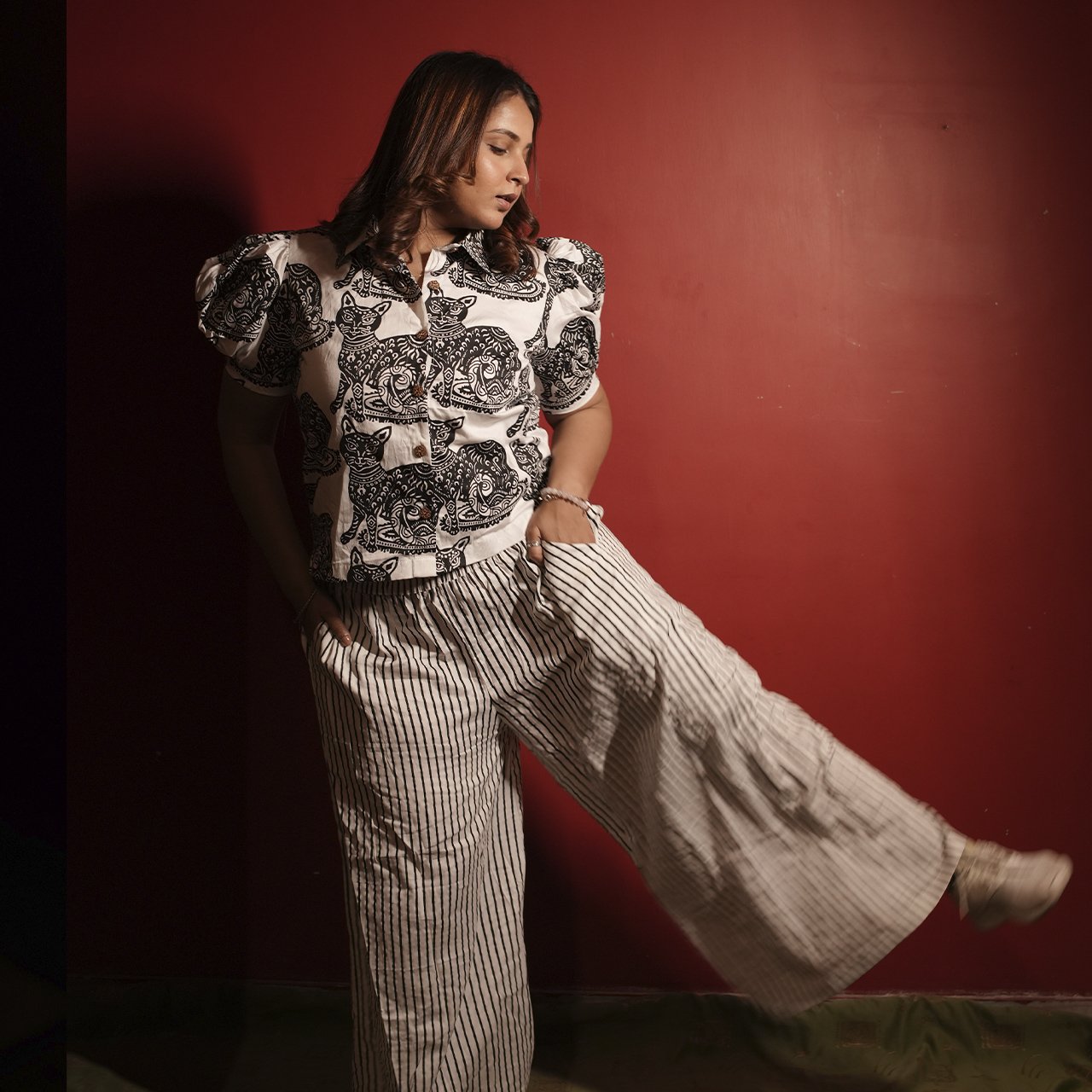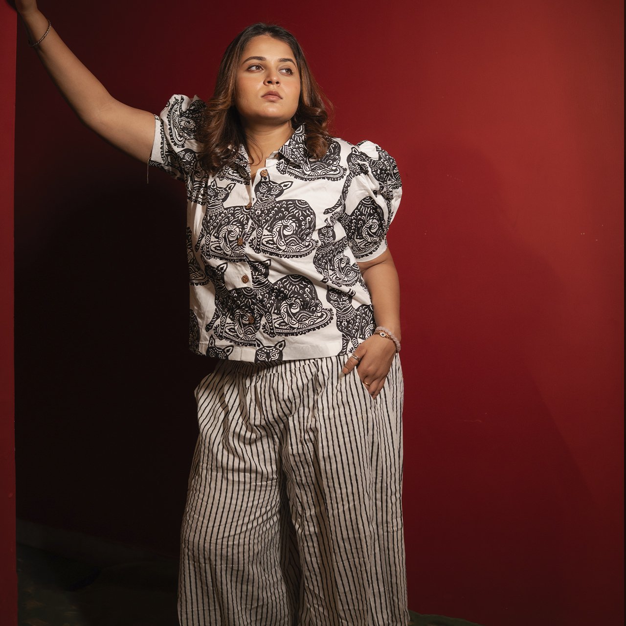 Women Black Cat Block Printed Co-ordinated Set Of Shirt And Stripe Printed Straight Pant.